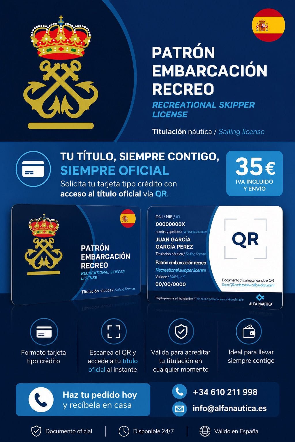 Convierte tu título náutico (PER, Patrón de Yate o Capitán de Yate) en una tarjeta práctica, resistente y fácil de llevar siempre contigo. En Alfa Náutica transformamos tu certificado oficial en un formato compacto tipo tarjeta bancaria, integrando el QR original para que puedas acreditarlo cómodamente en cualquier momento.